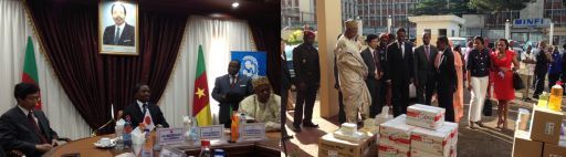 10月31日、ヤウンデ市内保健省にて、ママ・フダ保健大臣、当館新井大使及びギンドUNICEFカメルーン事務所臨時代表出席のもと、「カメルーン北部における緊急栄養対策及び学校インフラ復興」計画の引渡式が行われました。 同計画は、UNICEFの協力のもと、2012年に発生した洪水で被害を受けた極北州及び北部州での学校、トイレ、井戸の建設及び必要機材の供与を通じて、教育、給水・衛生、栄養・保健分野を支援しています。引渡式では、自動車、栄養食品、教材等の機材が並べられ、象徴的に自動車の鍵が保健大臣、初等教育省及び水・エネルギー省の関係者に贈呈されました。